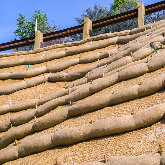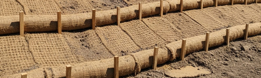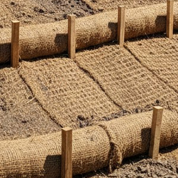 Biodegradable woven mesh made from natural jute fibers, used for slope stabilization and erosion control. Helps retain soil and moisture while promoting vegetation growth. Available in 4′ x 225′.